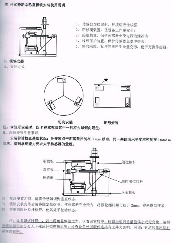 三.五,基础承载能力要求大于传感器的量程。袁女装之前,请将传感器调到垂直状态;暮袅安装完毕后请将固定板拆除,使传感器完全受力;将限位螺杆螺母松开2mm,将两螺母拧紧;专煎旬琨位拉杆松开,使其处于松动状态;冬调试过程中,若出现角差偏差过大、仪表回零!铰差、砝码加载后重量值偏小或无变化,请检暑蛩有无卡死或轻微摩擦影响;检查设备外围硬件连接有无外力影。