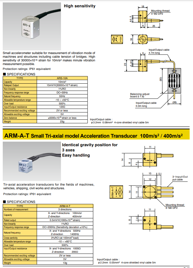| ARS-10A | 10m/s2 | 约15mV/V (30000×10-6 应变) | 1%RO | -10 ~ +50°C |