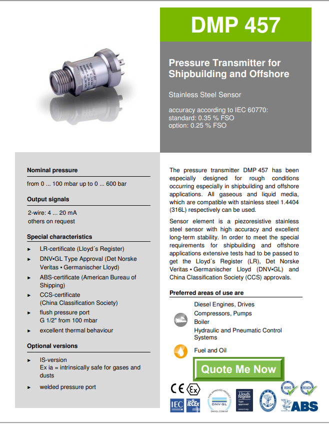 DMP457 是一种不锈钢造船海上压力传感器,设计用于船舶和造船行业,并通过了严格的相应行业认证。它是陶瓷版传感器DMK457 造船海上压力传感器的替代品。