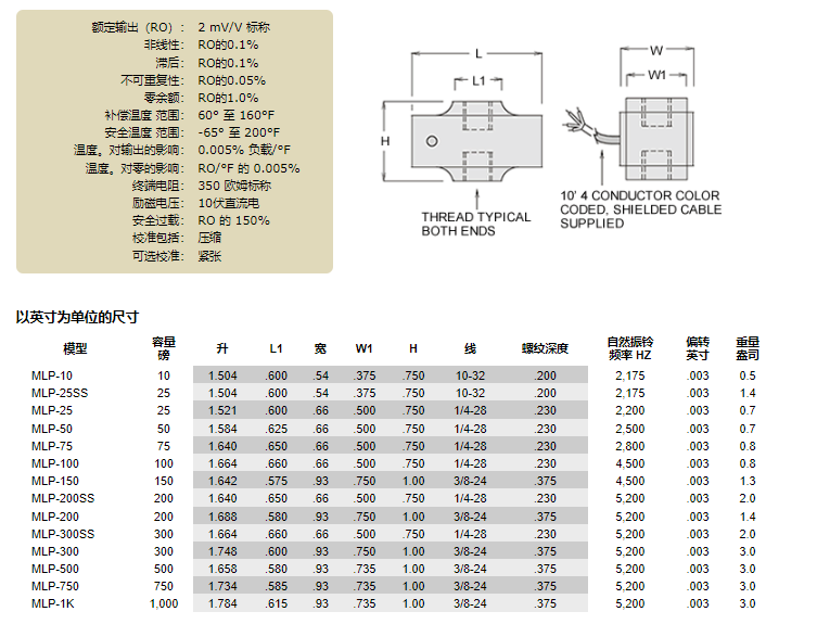 MLP系列 容量范围: 10, 25, 50, 75, 100, 150, 200, 300, 500, 750, 1,000 lb