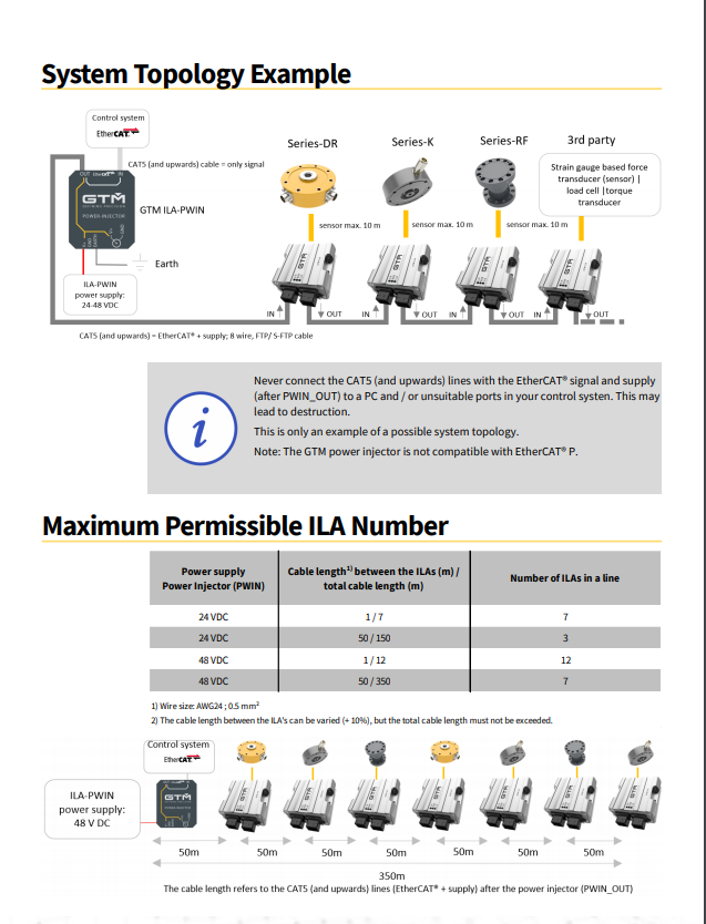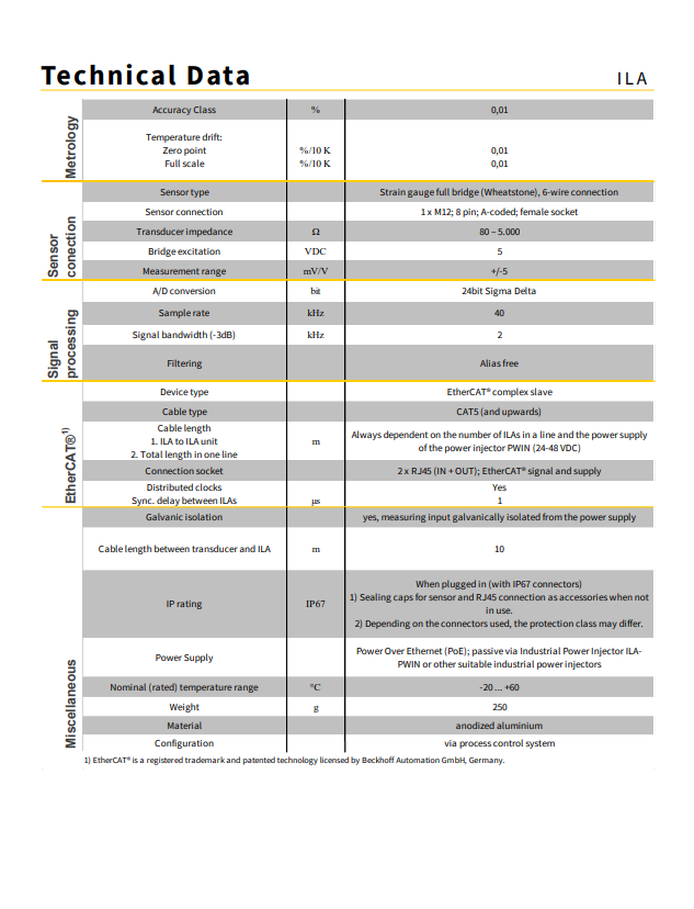 ILA 在传感器附近使用或安装。B. 直接在试验机中或直接在现场 - 即使在恶劣的环境条件下,所有连接(传感器和系统)都具有 IP67 防护等级。分散式方法显着缩短了必要的传感器测量线,这是测量性能和成本方面的重要优势,因为系统拓扑是使用工业 RJ45 电缆建立的。当然也可以选择在 DIN 导轨上安装开关柜。测量放大器通过以太网供电(无源 PoE)供电。这方面对系统成本有积极影响,尤其是在通道数量较多的情况下,因为 ILA 具有集成开关,根据电缆长度,可以轻松方便地连接大量 ILA。这适用于供电和高性能 EtherCAT 通信。