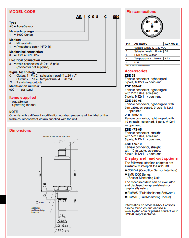 德国HYDAC贺德克系列产品,德国HYDAC AS 1000-(0.5bar~50bar)液压力传感器。