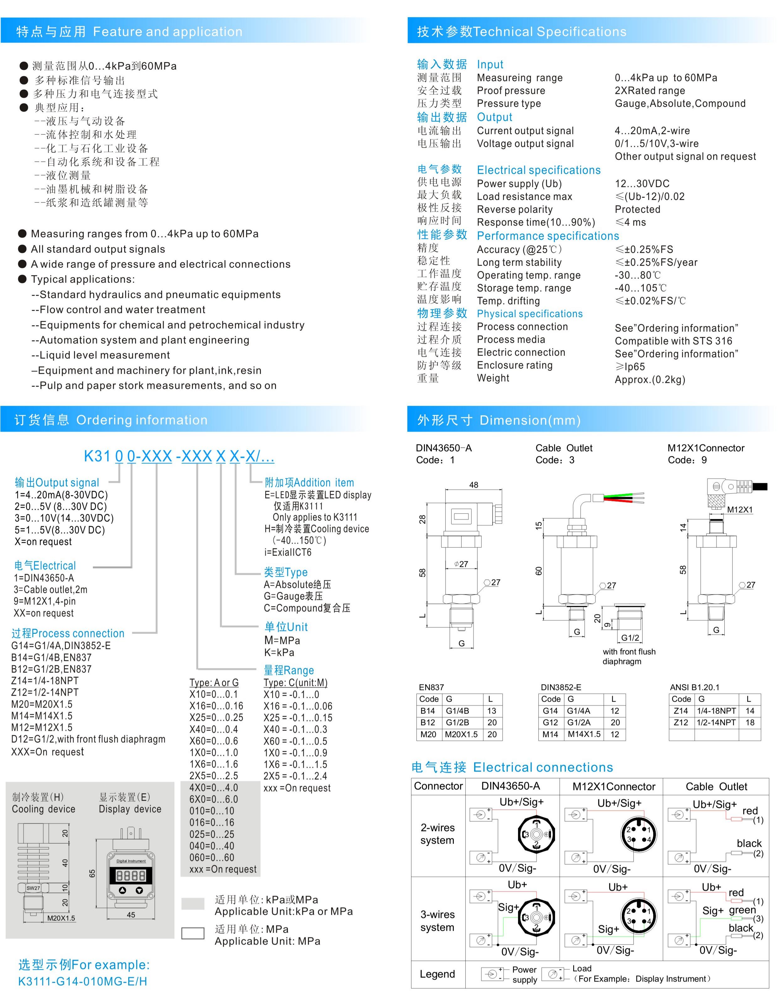 美国MkCells系列nowgoal365live score_365bet体育官网网址_365直播体育 传感器,MkCells K3100-(4KPa~60MPa)压力变送器。