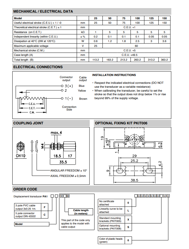 意大利GEFRAN杰弗伦系列产品,意大利GEFRAN PA1-(25mm~150mm)电位器。