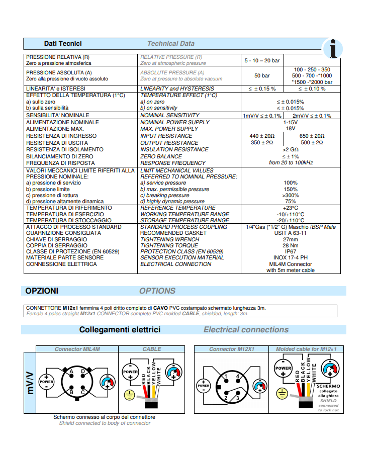压力变换器用于5bar到2000bar的相对绝对标称压力测量2mv/v输出线性和滞后0.10%