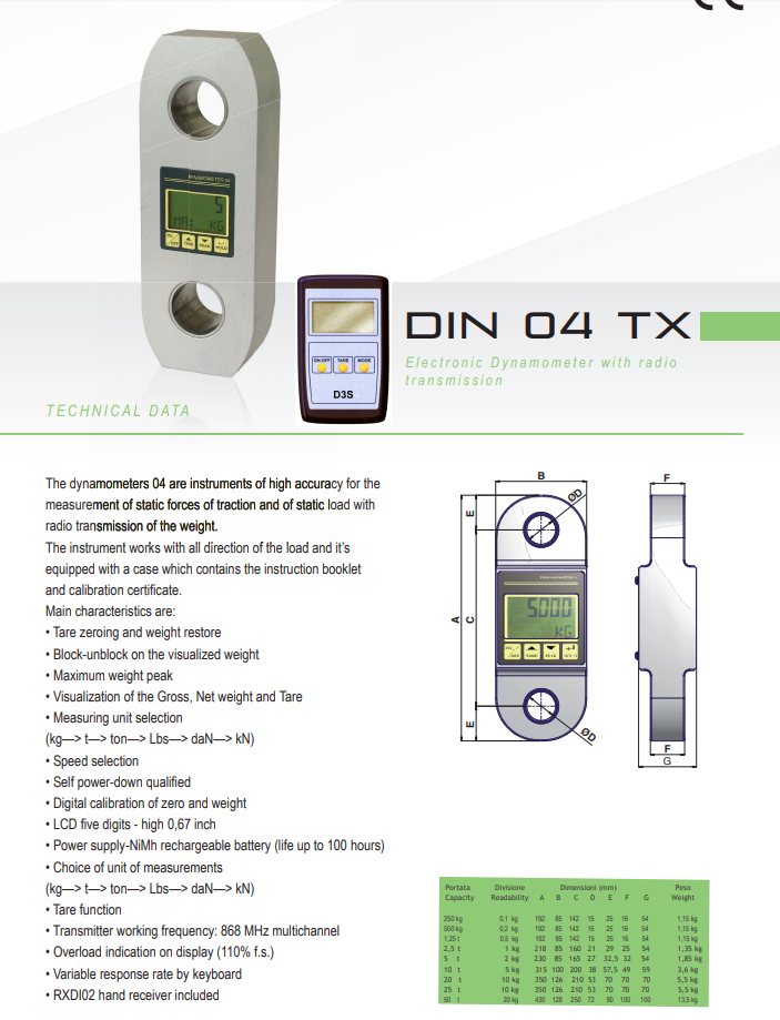 设计用于牵引静态力测量和静态负载,通过无线电传输至手动接收器仪器型号rx di02或rx02端口,传输频率为868 mhz,最远可达50米。