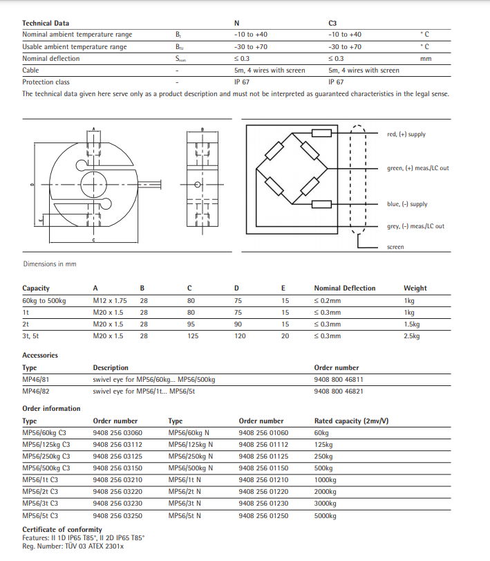 额定量程:60, 125, 250, 500kg, 1, 2, 3, 5t