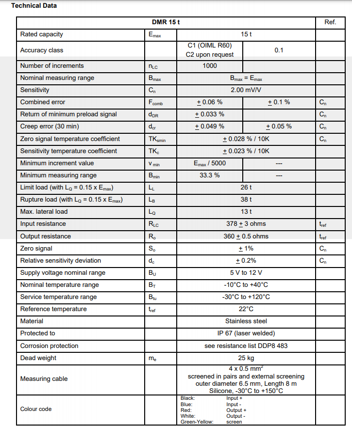 额定量程:15t 精度等级:0.1%, 0.06% 材质防护:不锈钢, IP67 内部阻抗:输入378Ω, 输出360Ω 使用温度:-30°C ~ +120°C