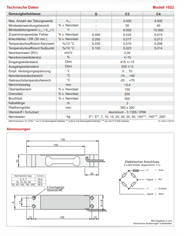 传感器构建平台秤非常简单。两块最大 350 x 350 mm 的钢或铝板通过电缆出口顶部前部或后部底部的两个旋入表面旋入,并连接相应的应变计测量装置或测量放大器 - 天平是准备好。