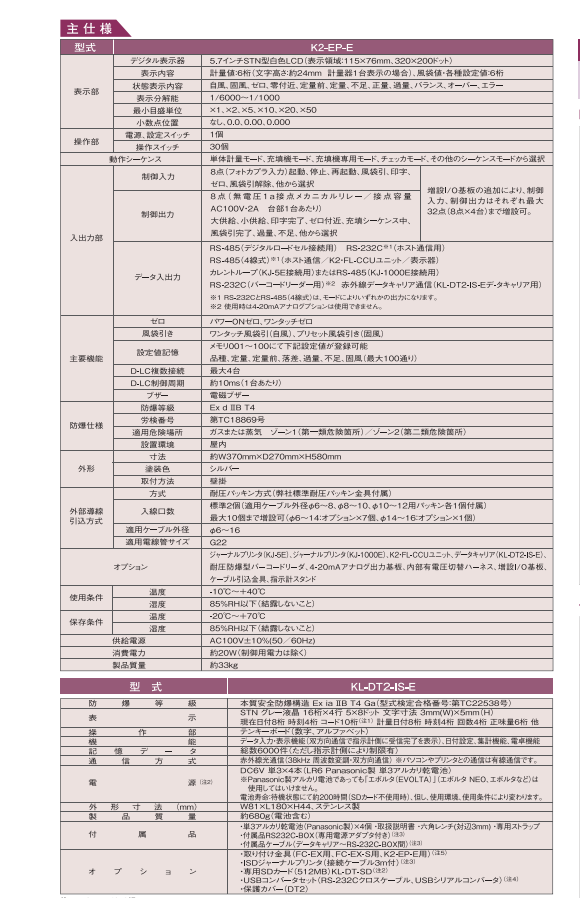 是可在区域1、区域2使用的隔爆型(防爆等级Ex d IIB T4 )的指示器。 可以与隔爆型的载置台部EX系列(或隔爆型的测压元件LU-BD-EX-SR、LU-FD-EX-SR )组合使用。 单体计量模式充填机模式充填机专用模式检查模式·时序模式5种可选的计量模式。 带有可以控制填充阀、盛液器、滚筒输送机等的多个输出信号,最适合构建计量系统、控制系统、填充系统。 也请将数据管理交给您,例如,可以通过数据记录器选项轻松、方便地将计量数据带出危险场所,可以在非危险场所在PC上进行数据处理和打印机打印等。