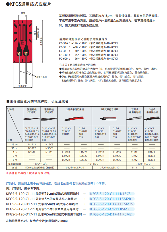 | 使用主要适用粘合剂硬化后的使用温度范围(℃) | CC-33A:-196~120℃ CC-35:-30~120℃ CC-36:-30~100℃ EP-340:-55~150℃ PC-600:-196~150℃ |