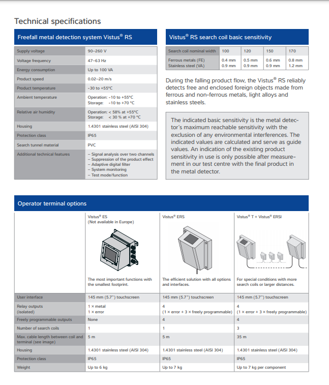 | 技术数据 | Vistus® RS自由下落式金属检测机 |