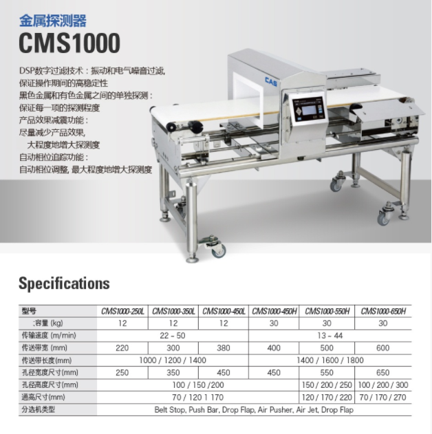 • CMS1000 金属探测器•DSP数字过滤技术• 黑色金属和有色金属之间的单独探测• 产品效果减震功能• 自动相位追踪功能