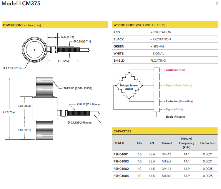 传感器型号具有非常坚固的 17-4 不锈钢结构,两端带有外螺纹和 10 英尺长的 28 AWG 4 导体屏蔽 PVC 电缆。该产品采用卓越的微型设计,高度为 2.77 英寸,直径为 1.12 英寸。您还可以找到用于外部匹配输出或现成的 Teflon 电缆的选项。如需更多容量选项,请参阅 LCM300 或 LCM325。