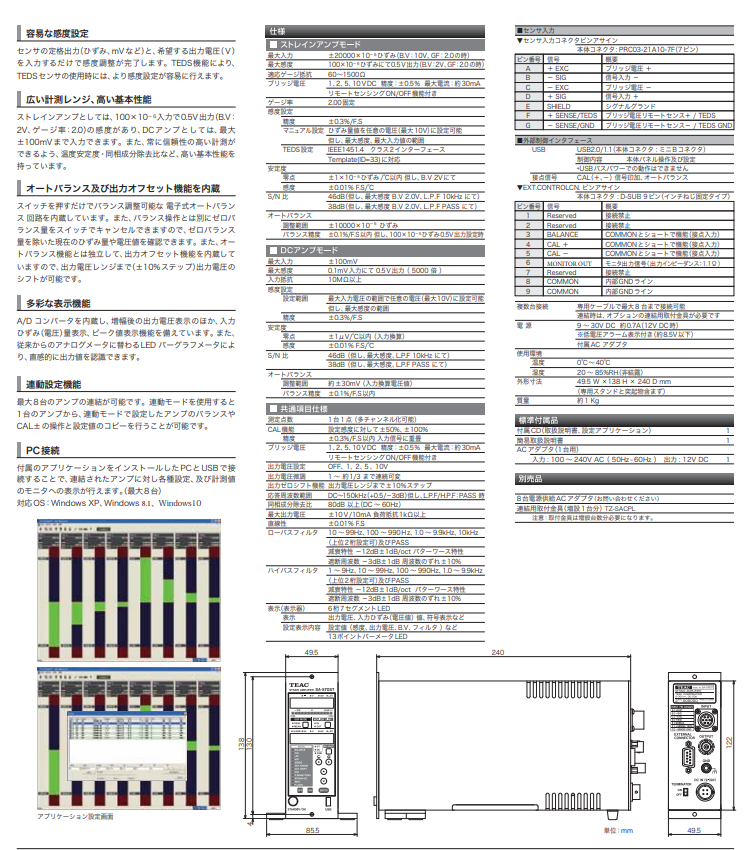 配备电桥电源、自动平衡、校准电压、低通滤波器、高通滤波器等应变测量和电压测量所需的基本功能,具有高达5000倍的灵敏度和高频段频率特性DC 至 150 kHz。此外,它还支持TEDS(IEEE1451.4 Class 2接口),可以轻松设置灵敏度。