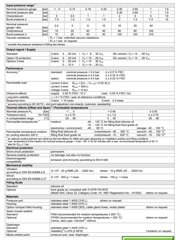 • 范围:0-100mbar 至 0-40bar