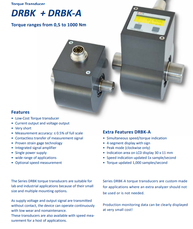 由德国 ETH Messtechnik 制造的 DRBK 低成本旋转扭矩传感器系列具有平行轴连接,并为连续旋转、高占空比应用中的扭矩测量提供预算选项,其中要测量的扭矩不超过 1000Nm。