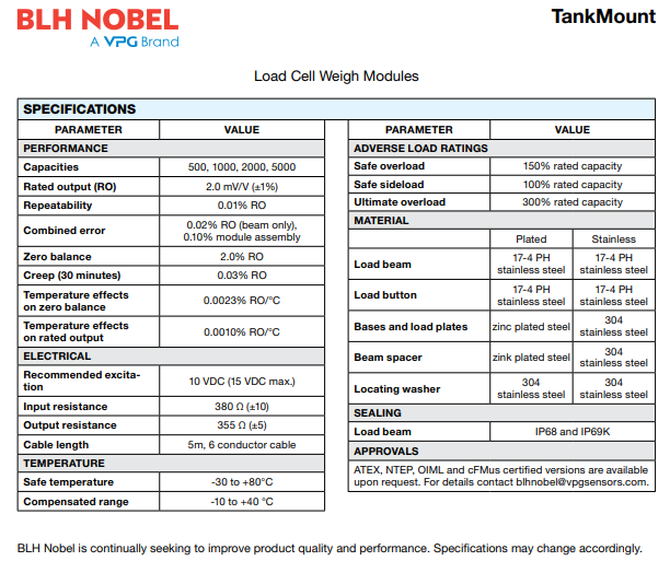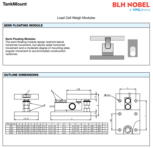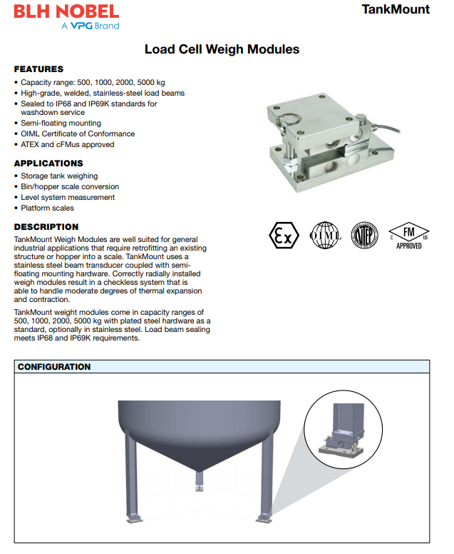 Tank Mount重量模块的容量范围为500,1000,2000,5000公斤,镀钢硬件作为标准,可选的不锈钢。